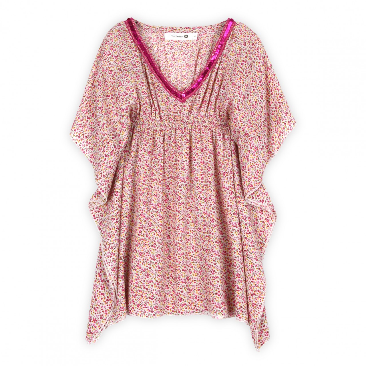 Flower-printed djallaba blouse made of very fine voile. V neck underlined with sequins. Gather detail on the chest and at the back. Short sleeves. The dress for the beach.
