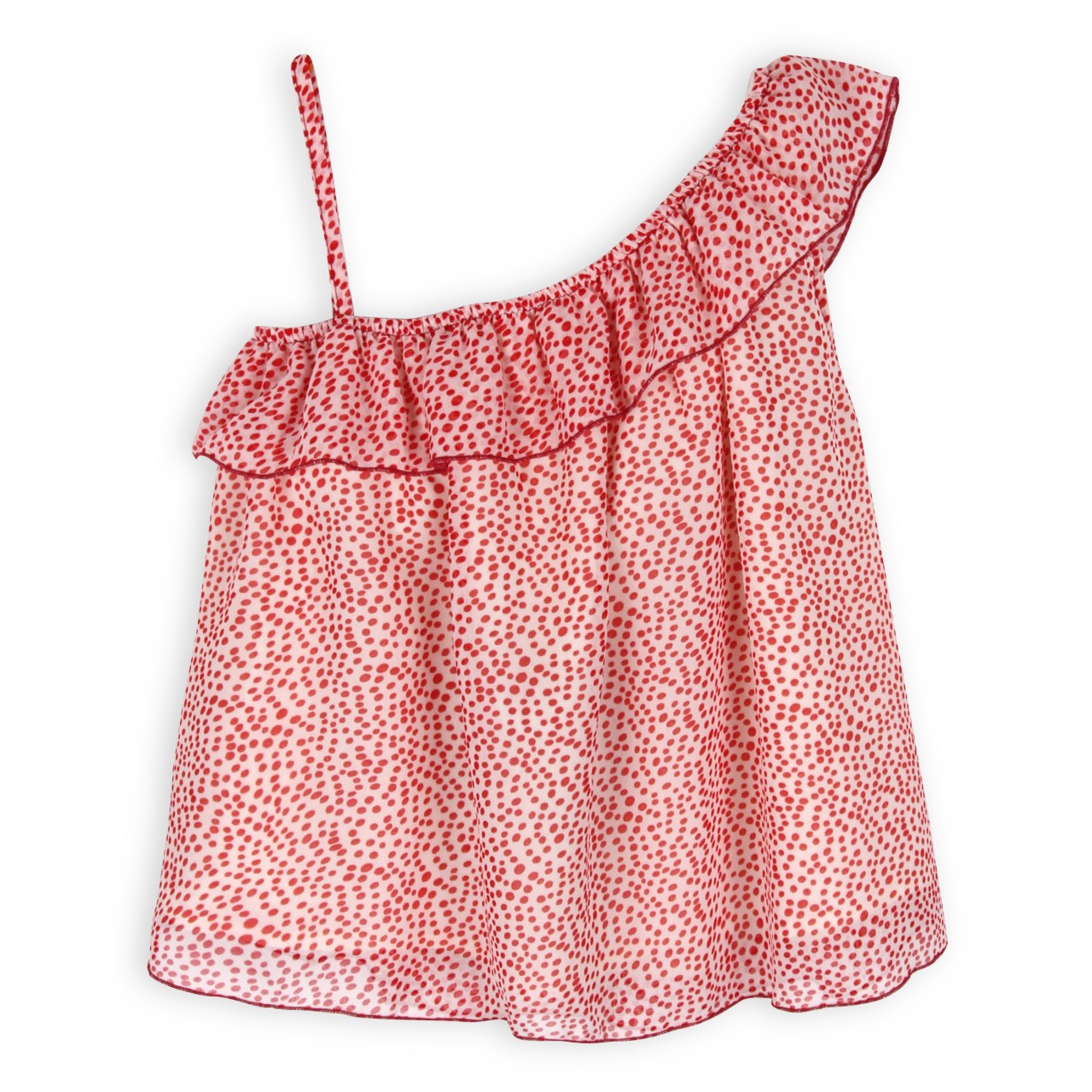 Chiffon printed top, 100% cotton lining. Asymmetric flounced neck line. Very easy to adjust with spaghetti straps. Perfect for sunny summer days.